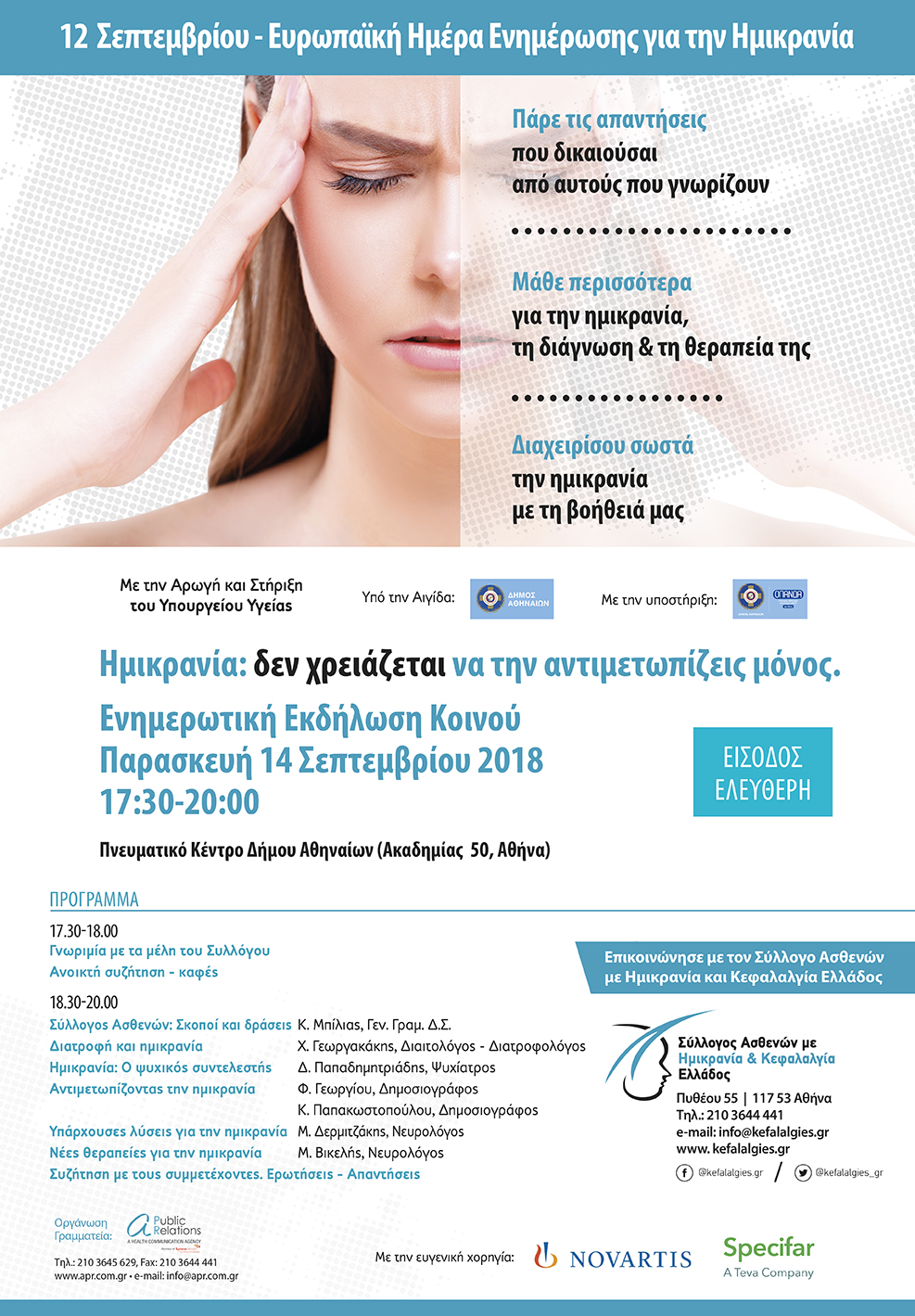 Με αφορμή την Ευρωπαϊκή Ημέρα Κεφαλαλγίας (12 Σεπτεμβρίου) ο Σύλλογος Ασθενών με Κεφαλαλγία και Ημικρανίας Ελλάδος οργανώνει ενημερωτική εκδήλωση κοινού την Παρασκευή 14 Σεπτεμβρίου, από τις 17:00 έως τις 20:00, στο Πνευματικό Κέντρο του Δήμου Αθηναίων (Ακαδημίας 50, Αθήνα )