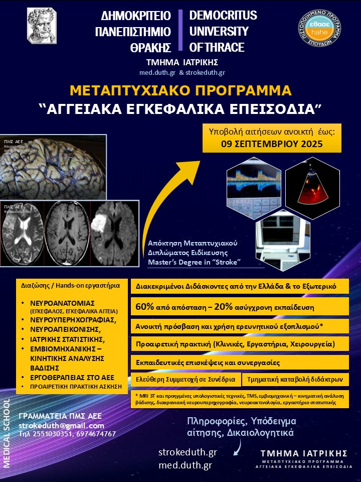 Σας προωθούμε ενημέρωση που αφορά νέα προκήρυξη για εισαγωγή μεταπτυχιακών σπουδαστών στο ΠΜΣ "Αγγειακά Εγκεφαλικά Επεισόδια" του Τμήματος Ιατρικής του Δ.Π.Θ. για συναδέλφους και συνεργάτες (ειδικευόμενους, ιατρούς άλλων ειδικοτήτων, συνεργάτες επαγγελματίες υγείας).