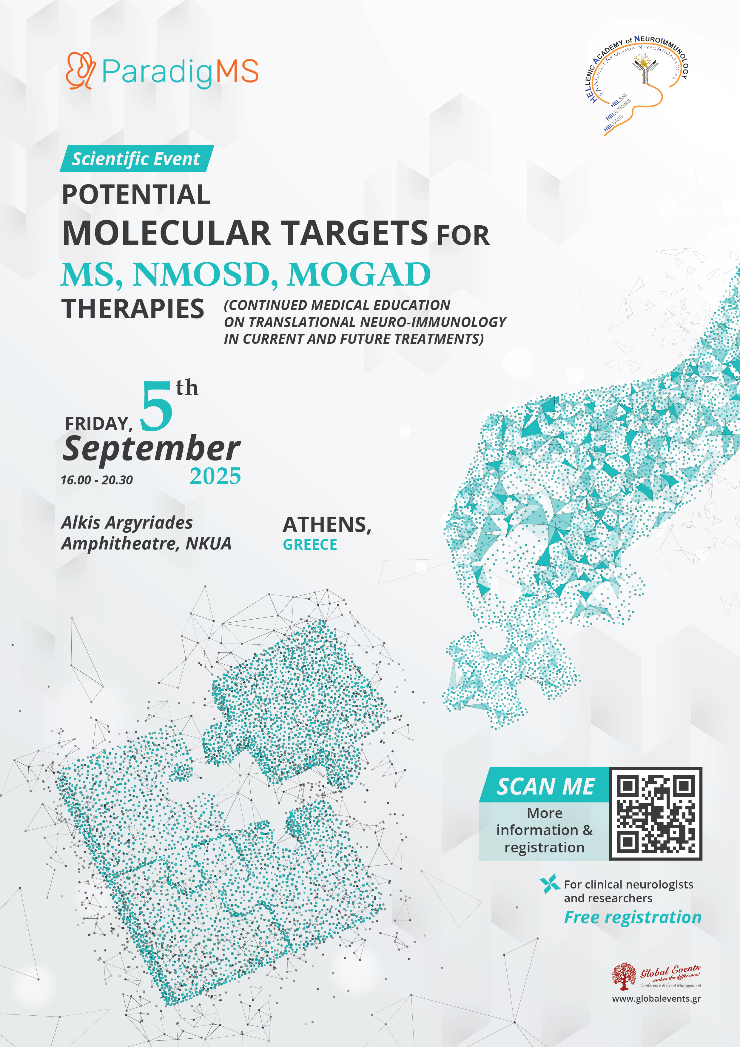 Διοργάνωση Hμερίδας Συνεχιζόμενης Εκπαίδευσης στη Μεταφραστική Νευροανοσολογία υπό τον τίτλο «Τρέχοντες και πιθανοί μοριακοί στόχοι για θεραπείες MS, NMOSD και MOGAD». Η Ημερίδα θα λάβει χώρα την Παρασκευή 5 Σεπτεμβρίου 2025, στο Αμφιθέατρο Άλκης Αργυριάδης, Προπύλαια Εθνικού και Καποδιστριακού Πανεπιστημίου Αθηνών.