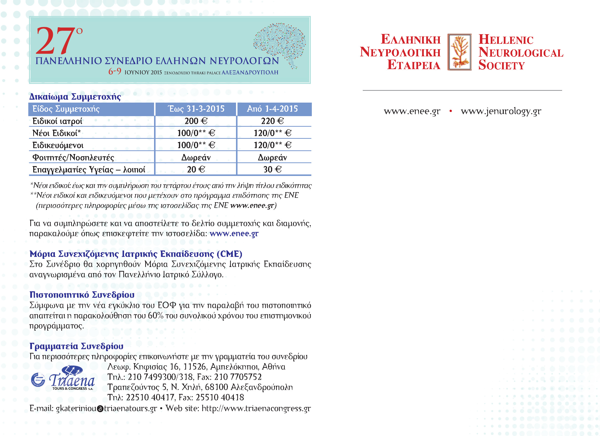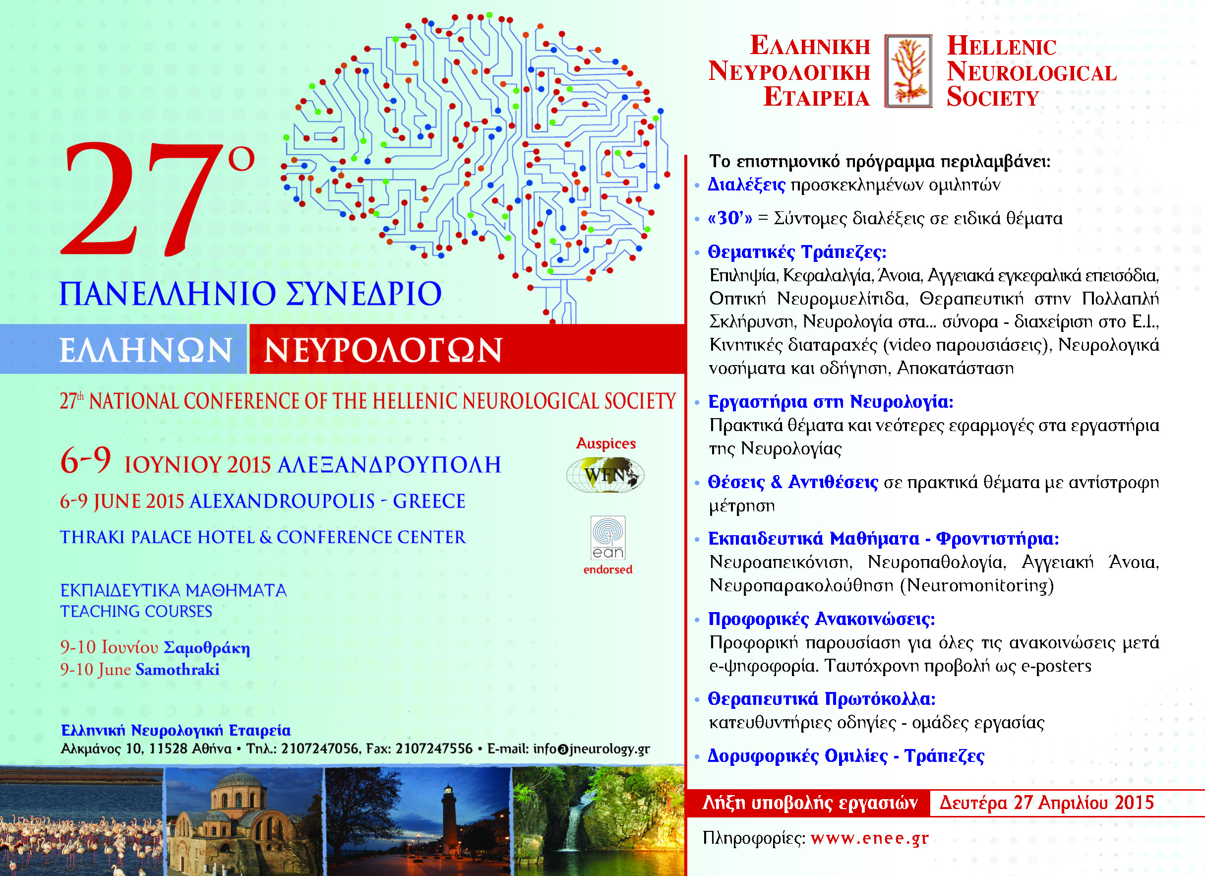 ο 27ο Πανελλήνιο Συνέδριο Ελλήνων Νευρολόγων θα διεξαχθεί στην Αλεξανδρούπολη, 6-9 Ιουνίου 2015 & στη Σαμοθράκη, 9-10 Ιουνίου 2015. Το 27ο Πανελλήνιο Συνέδριο Ελλήνων Νευρολόγων θα διεξαχθεί στην Αλεξανδρούπολη,6-9 Ιουνίου 2015 & στη Σαμοθράκη,9-10 Ιουνίου 2015.